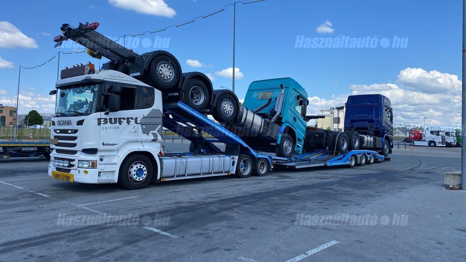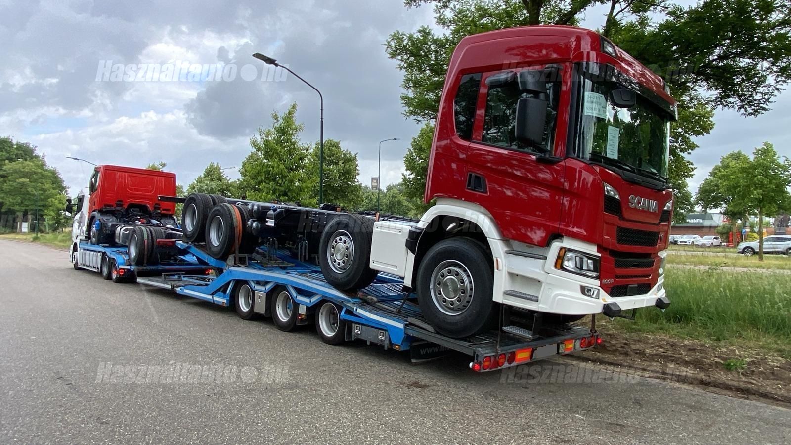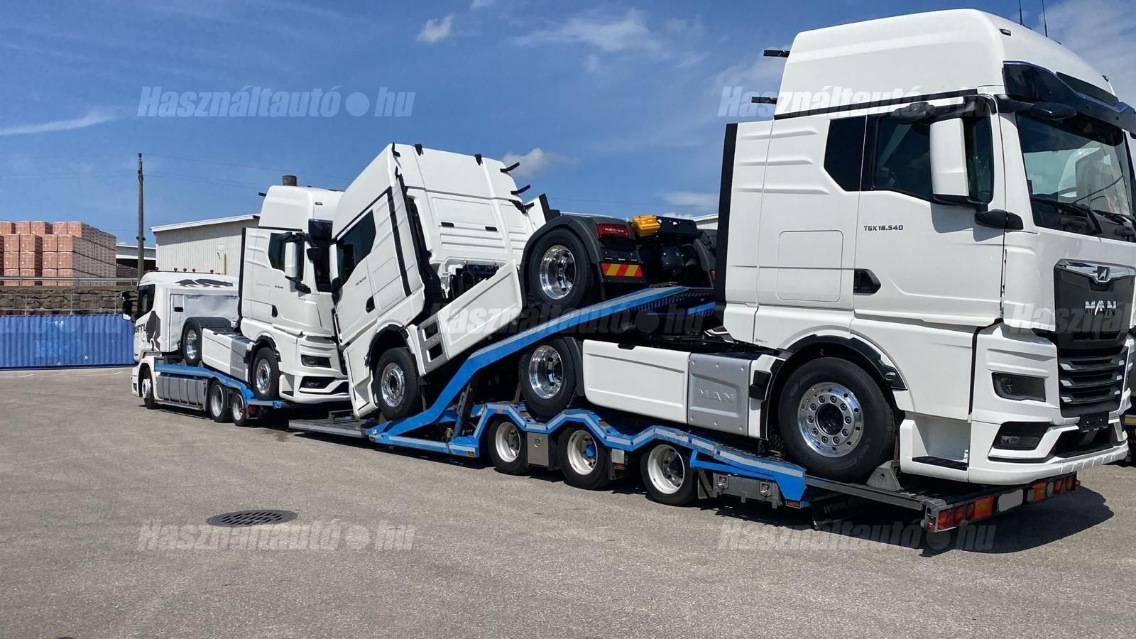 SCANIA R450 EU6 6X2, GS-Meppel alumínium járműszállító felépítmény, melynek szélessége: 2,55m, magassága és hossza hidraulikusan állítható, retarder, automata váltó, tárcsafék, emelhető tengely, elől hátul légrugó. Automata klíma, állítható kormány, állófűtés, állóklíma, központi zár, differenciálzár, tempomat, ABS, EBS, elektromos ablakok és tükrök, tükörfűtés, aláfutásgátló, rádió, 1 ágy, ülésfűtés, hűtőbox, gyári kávéfőző, napellenző, forgólámpa, Vorlandi vonófej (vontatás: 35,000kg). Tengelytávolság A-B tengely: 4,3m, B-C tengely: 1m. Gumiméret az első tengelyen 315/60 R22,5, középső tengelyen: 315/45 R22,5, hátsó tengelyen: 205/65 R17,5. Gumiállapot az első két tengelyen ca. 80%, hátsó tengelyen új gumik. Önsúly: 11,150kg, össztömeg: 23,500kg, hasznos: 12,350kg. Technikailag megengedett legnagyobb össztömeg: 58,500kg. Pótkocsi: GS MEPPEL AN-2400 TR járműszállító, 2009 évjárat, hidraulikusan emelhető és hosszában állítható felépítmény, melynek szélessége: 2,48m. Emelhető hátsó tengely, légrugó, dobfék, ABS, EBS, alumínium rámpák, aláfutásgátló. Tengelytávolság A-B tengely: 1,3m, B-C tengely: 1,2m. Gumiméret az első tengelyen: 235/75 R17,5, középső tengelyen: 245/70 R17,5, hátsó tengelyen: 205/65 R17,5. Gumiállapot ca. 70%. Önsúly: 7,400kg, össztömeg: 24,000kg, hasznos: 16,600kg. Igény szerint friss műszakival! A hirdetésben szereplő Forintos ár 380 huf/euróra vonatkozó ár! Pontos forintos ár az aktuális napi euró MNB árfolyamától függően kerül kialakításra!