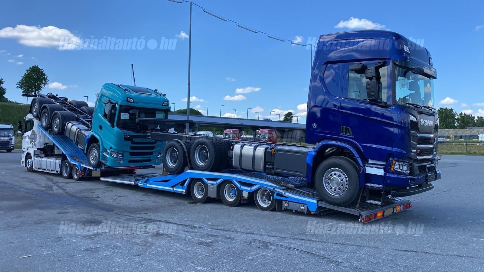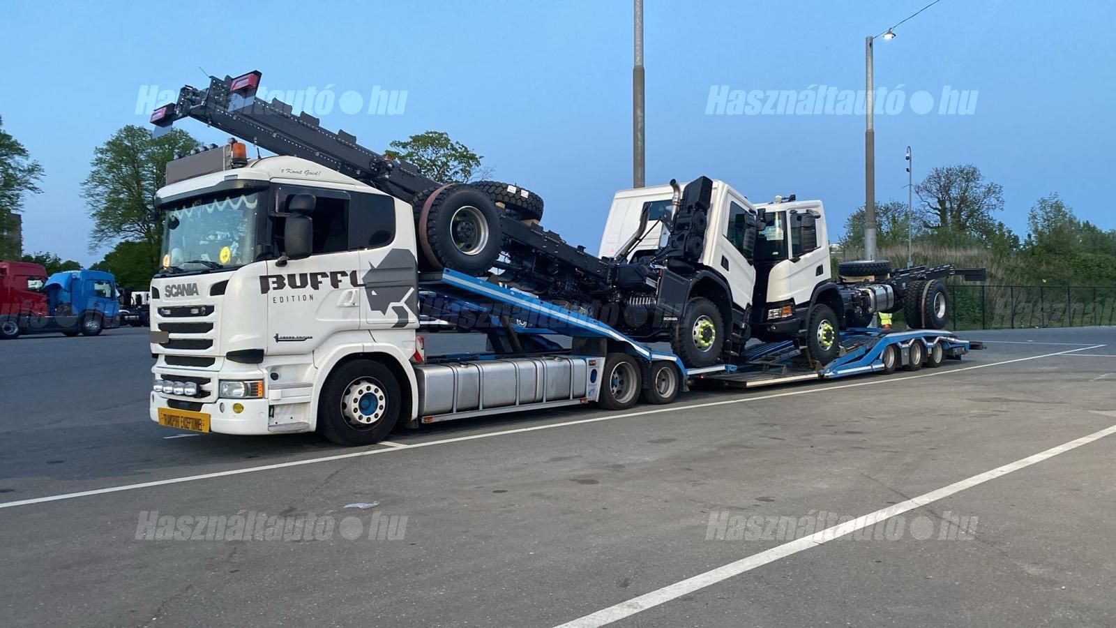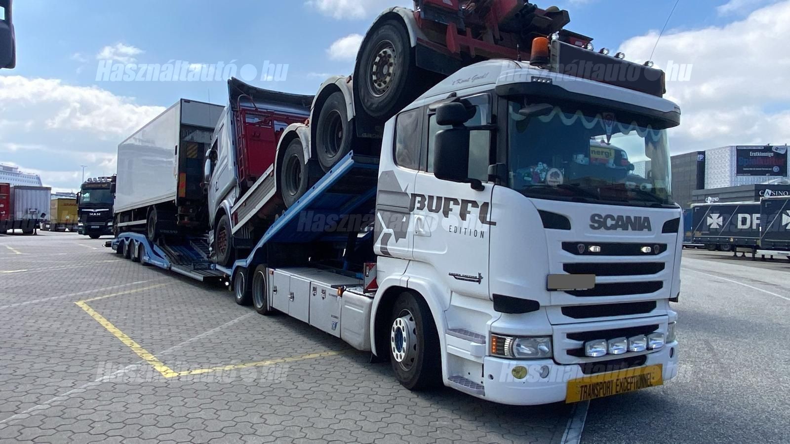 SCANIA R450 EU6 6X2, GS-Meppel alumínium járműszállító felépítmény, melynek szélessége: 2,55m, magassága és hossza hidraulikusan állítható, retarder, automata váltó, tárcsafék, emelhető tengely, elől hátul légrugó. Automata klíma, állítható kormány, állófűtés, állóklíma, központi zár, differenciálzár, tempomat, ABS, EBS, elektromos ablakok és tükrök, tükörfűtés, aláfutásgátló, rádió, 1 ágy, ülésfűtés, hűtőbox, gyári kávéfőző, napellenző, forgólámpa, Vorlandi vonófej (vontatás: 35,000kg). Tengelytávolság A-B tengely: 4,3m, B-C tengely: 1m. Gumiméret az első tengelyen 315/60 R22,5, középső tengelyen: 315/45 R22,5, hátsó tengelyen: 205/65 R17,5. Gumiállapot az első két tengelyen ca. 80%, hátsó tengelyen új gumik. Önsúly: 11,150kg, össztömeg: 23,500kg, hasznos: 12,350kg. Technikailag megengedett legnagyobb össztömeg: 58,500kg. Pótkocsi: GS MEPPEL AN-2400 TR járműszállító, 2009 évjárat, hidraulikusan emelhető és hosszában állítható felépítmény, melynek szélessége: 2,48m. Emelhető hátsó tengely, légrugó, dobfék, ABS, EBS, alumínium rámpák, aláfutásgátló. Tengelytávolság A-B tengely: 1,3m, B-C tengely: 1,2m. Gumiméret az első tengelyen: 235/75 R17,5, középső tengelyen: 245/70 R17,5, hátsó tengelyen: 205/65 R17,5. Gumiállapot ca. 70%. Önsúly: 7,400kg, össztömeg: 24,000kg, hasznos: 16,600kg. Igény szerint friss műszakival! A hirdetésben szereplő Forintos ár 380 huf/euróra vonatkozó ár! Pontos forintos ár az aktuális napi euró MNB árfolyamától függően kerül kialakításra!