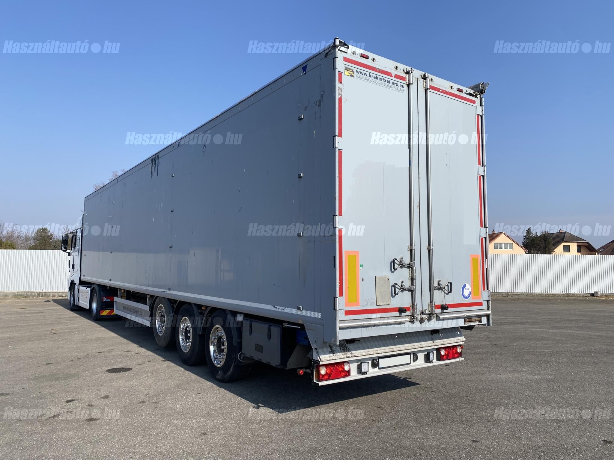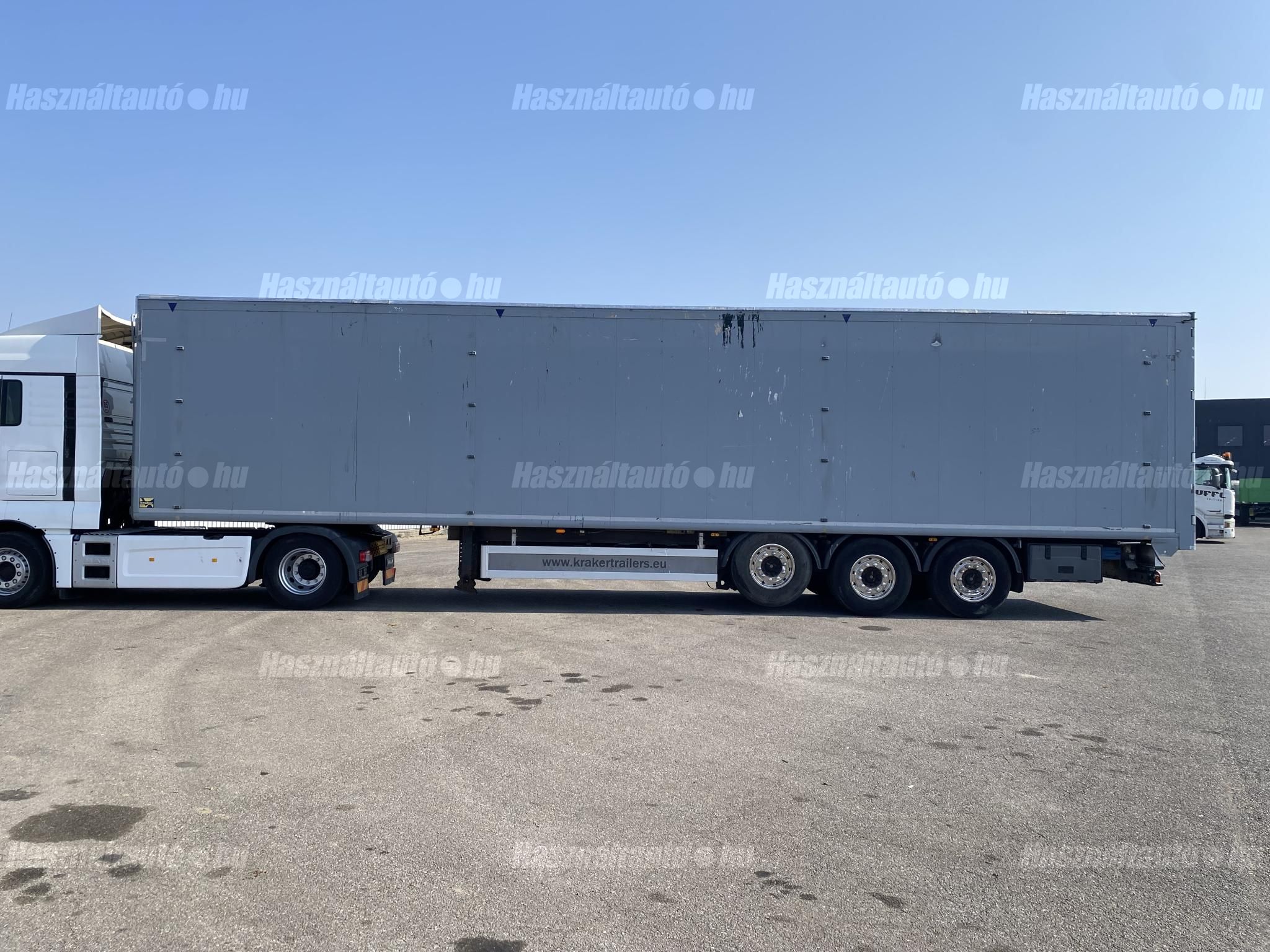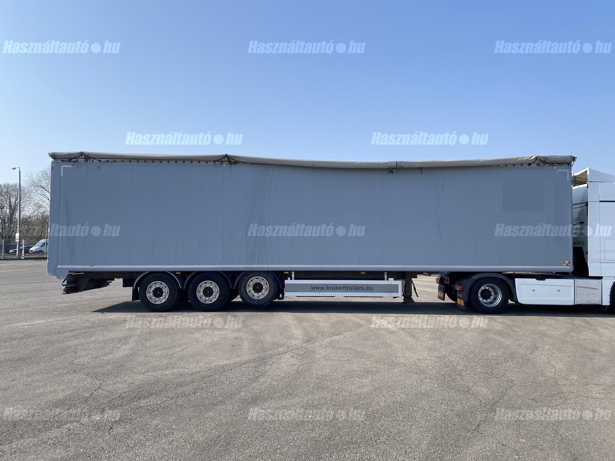 KRAKER CF-Z önkihordós pótkocsi, 90m3, emelhető tengely, SAF tengelyek, légrugó, tárcsafék, ABS, EBS, aláfutásgátló, pótkeréktartó, ponyva, be- és kihordásra alkalmas. Plató hossza: 13,6m, szélessége: 2,47m, magassága: 2,73m. Tengelytávolság: 1,3m-1,3m. Gumiméret: 385/65 R22,5. Gumiállapot az első tengelyen ca. 65%, hátsó tengelyeken ca. 40%. Önsúly: 7,500kg, össztömeg: 36,000kg, hasznos: 28,500kg. Igény szerint friss műszakival! Uniós adószámmal rendelkező cégek igény szerint áfa mentesen ( nettó) is megvásárolhatják. A hirdetésben szereplő Forintos ár 380 huf/euróra vonatkozó ár! Pontos forintos ár az aktuális napi euró MNB árfolyamától függően kerül kialakításra! (69105)