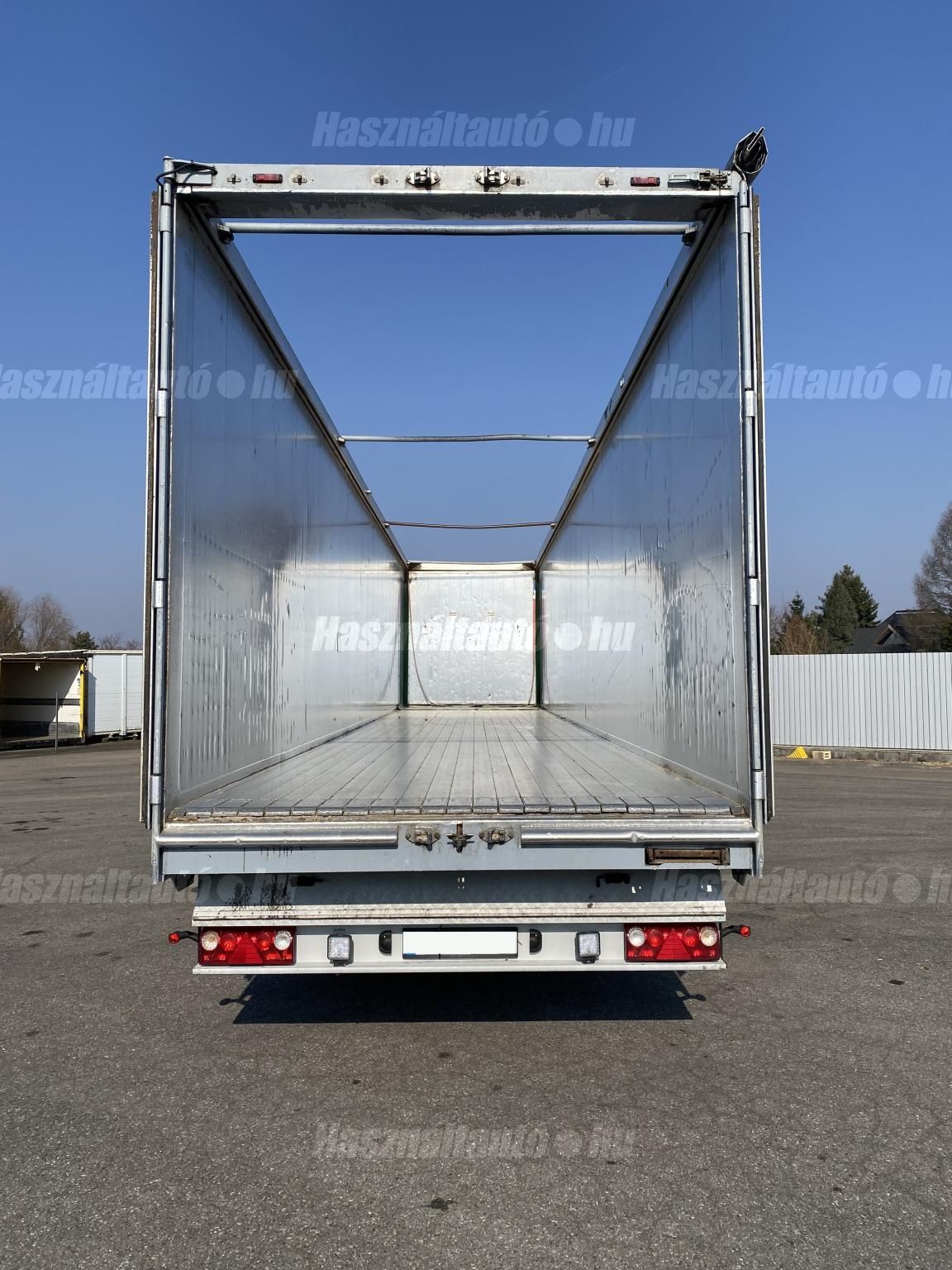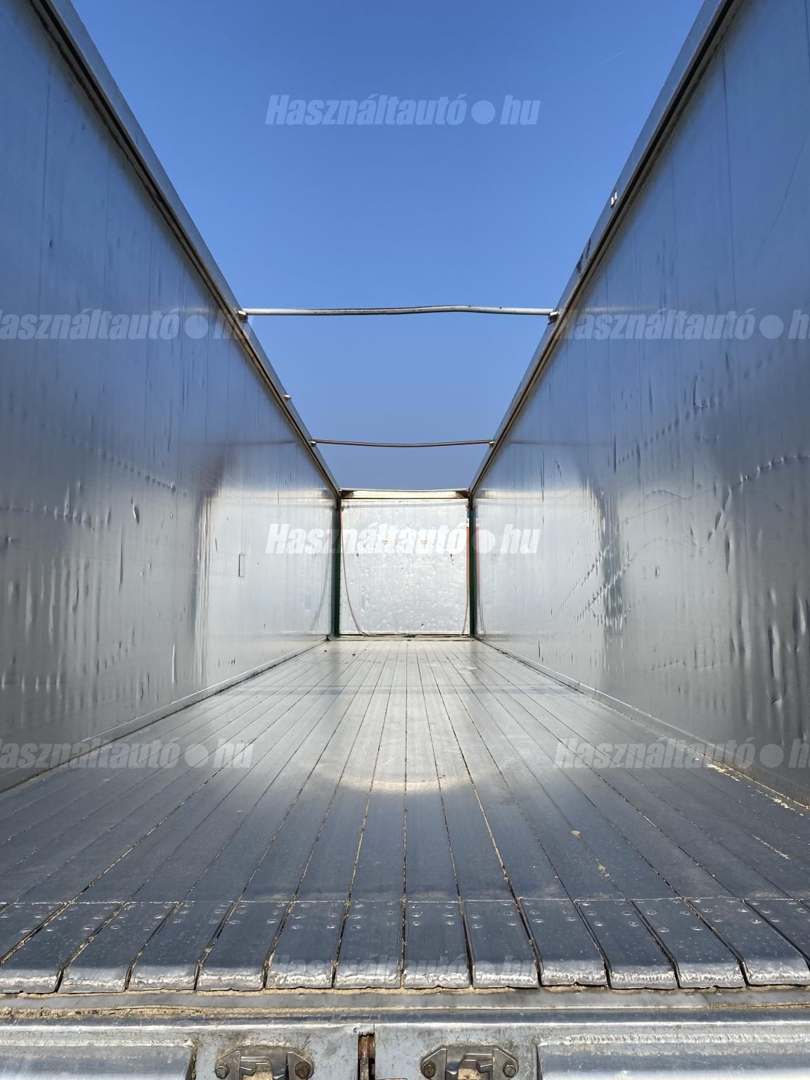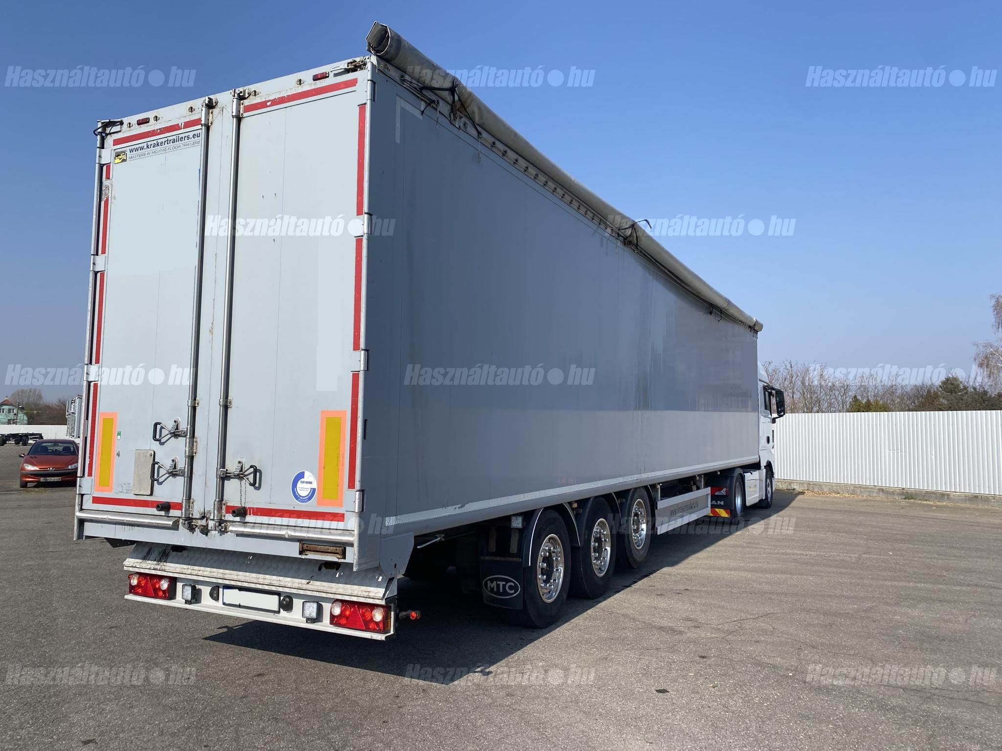 KRAKER CF-Z önkihordós pótkocsi, 90m3, emelhető tengely, SAF tengelyek, légrugó, tárcsafék, ABS, EBS, aláfutásgátló, pótkeréktartó, ponyva, be- és kihordásra alkalmas. Plató hossza: 13,6m, szélessége: 2,47m, magassága: 2,73m. Tengelytávolság: 1,3m-1,3m. Gumiméret: 385/65 R22,5. Gumiállapot az első tengelyen ca. 65%, hátsó tengelyeken ca. 40%. Önsúly: 7,500kg, össztömeg: 36,000kg, hasznos: 28,500kg. Igény szerint friss műszakival! Uniós adószámmal rendelkező cégek igény szerint áfa mentesen ( nettó) is megvásárolhatják. A hirdetésben szereplő Forintos ár 380 huf/euróra vonatkozó ár! Pontos forintos ár az aktuális napi euró MNB árfolyamától függően kerül kialakításra! (69105)