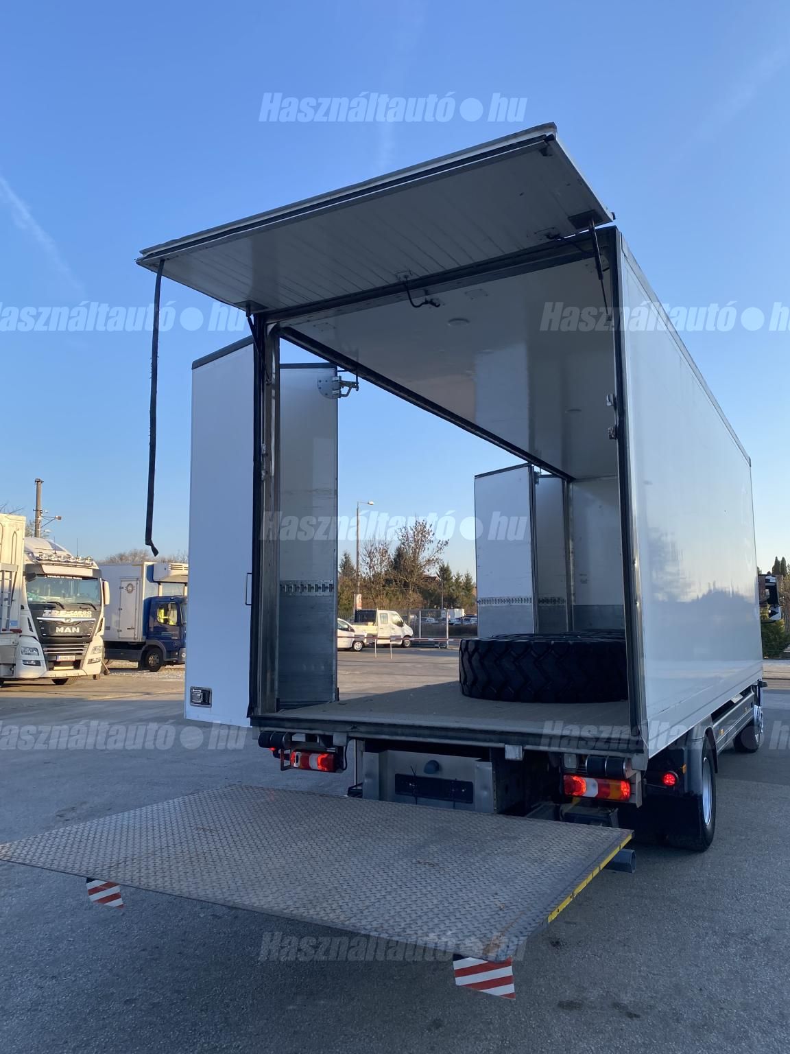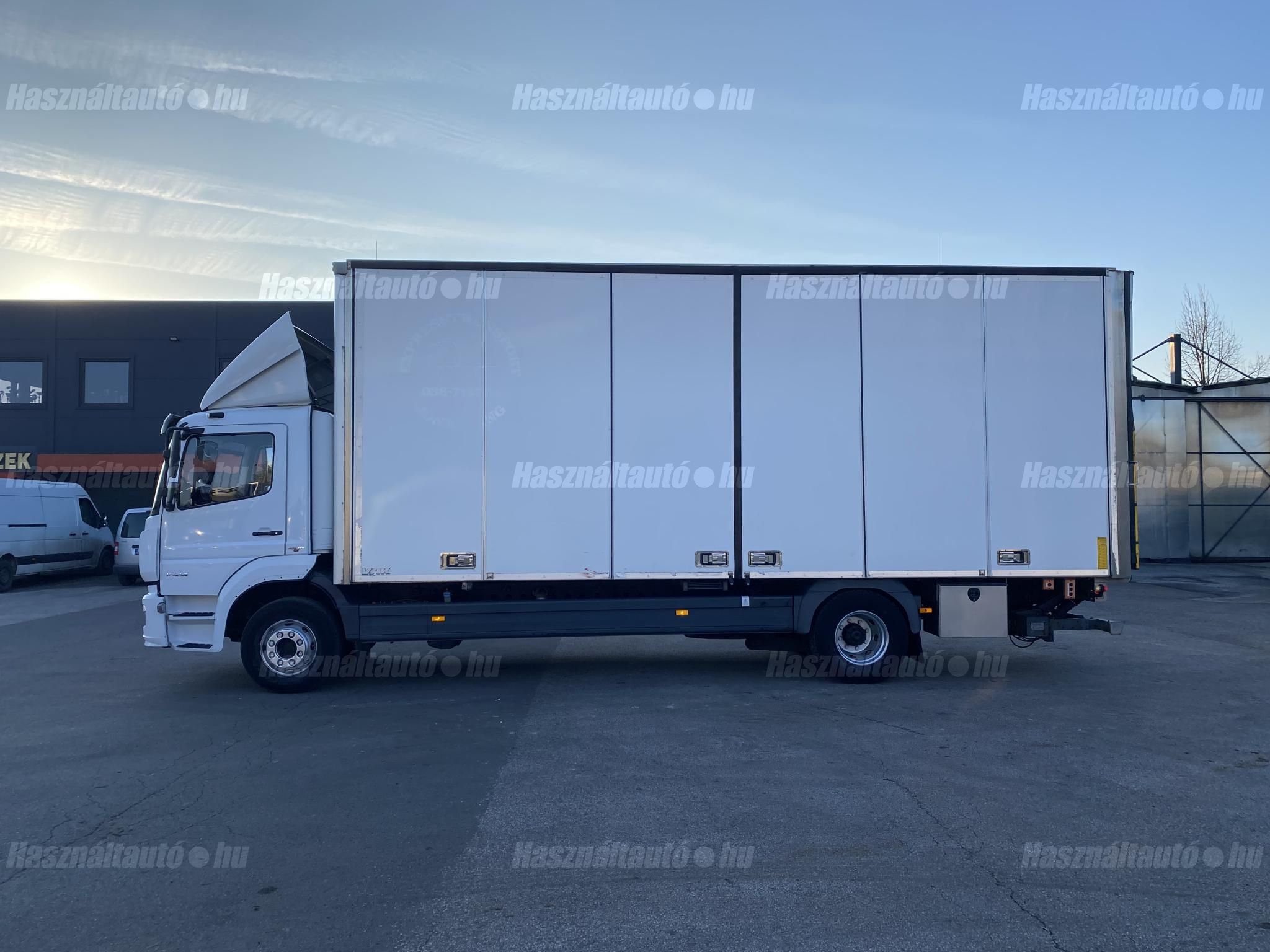 Mercedes Atego 1624, EU6, nyitható oldalú dobozos felépítmény, Zepro emelőhátfal (teherbírás: 2,000kg), automata váltó, tárcsafék, elől laprugó, hátul légrugó. Manuális klíma, állítható kormány, központi zár, differenciálzár, tempomat, ülésfűtés, elektromos ablakok és tükrök, tükörfűtés, sávtartó- és távolságtartó elektronika, ABS, EBS, rádió, kamera, légterelő, aláfutásgátló, Ad-blue, napellenző. Tengelytávolság: 5,36m. Plató hossza: 7,5m, szélessége: 2,52m, magassága: 2,78m. Gumiméret: 305/70 R19,5. Önsúly: 7,150kg, össztömeg: 16,020kg, hasznos: 8,870kg. Igény szerint friss műszakival! Akár nettó áron (áfa mentesen) is megvásárolhatják az uniós adószámmal rendelkező cégek. A hirdetésben szereplő Forintos ár 380 huf/euróra vonatkozó ár! Pontos forintos ár az aktuális napi euró MNB árfolyamától függően kerül kialakításra!