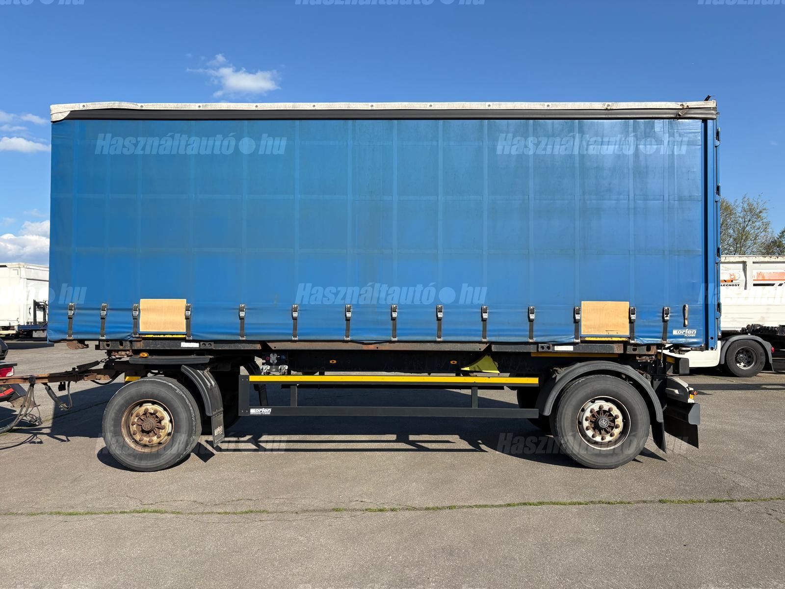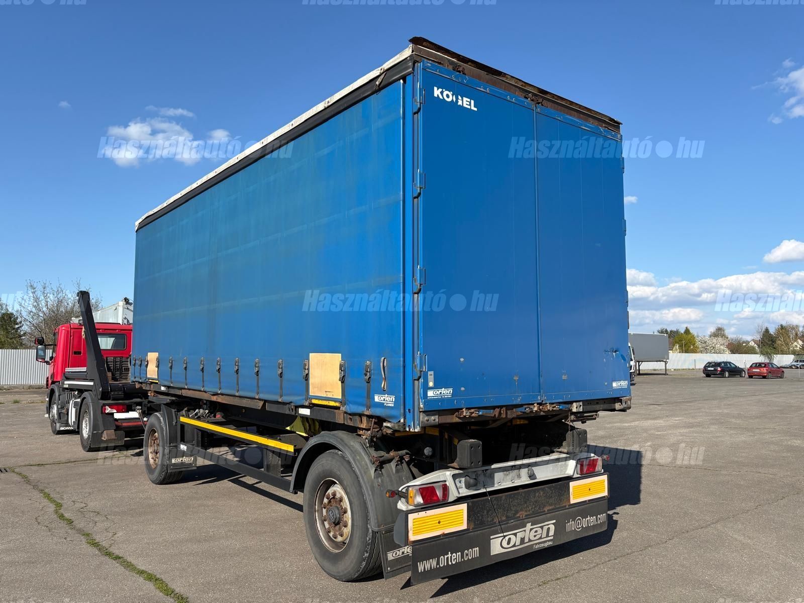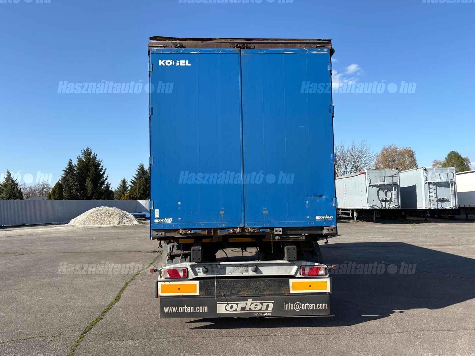 KÖGEL ENCO74 BDF függönyponyvás felépítmény, hátsó portálajtó, melynek hossza: 7,3m, szélessége: 2,5m, magassága: 2,75m. A felépítmény önsúlya: 2,486kg, össztömeg: 16,000kg, hasznos: 13,514kg.