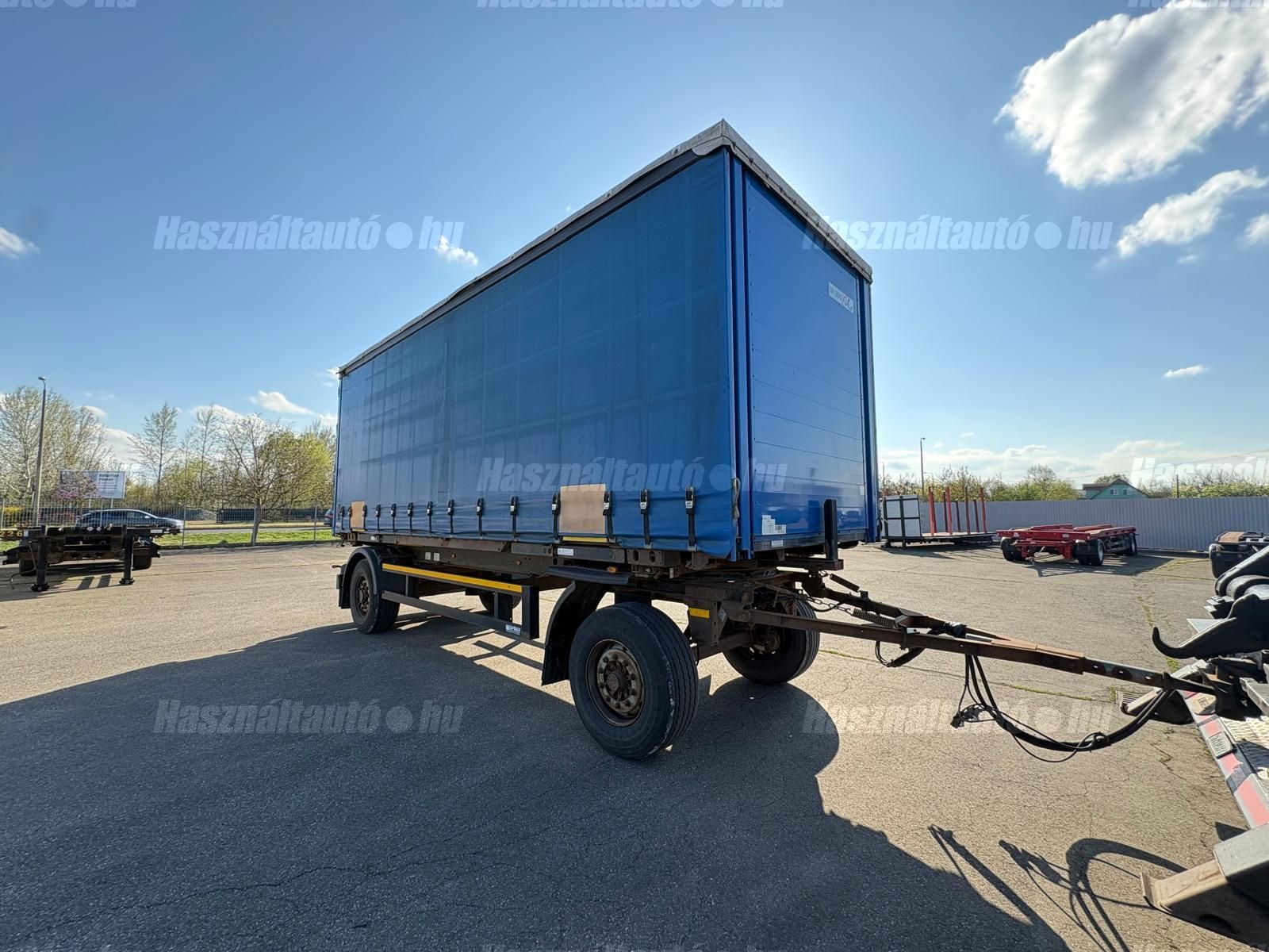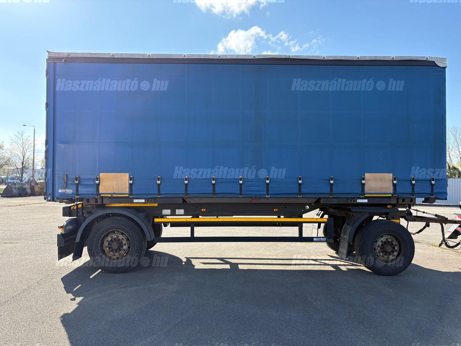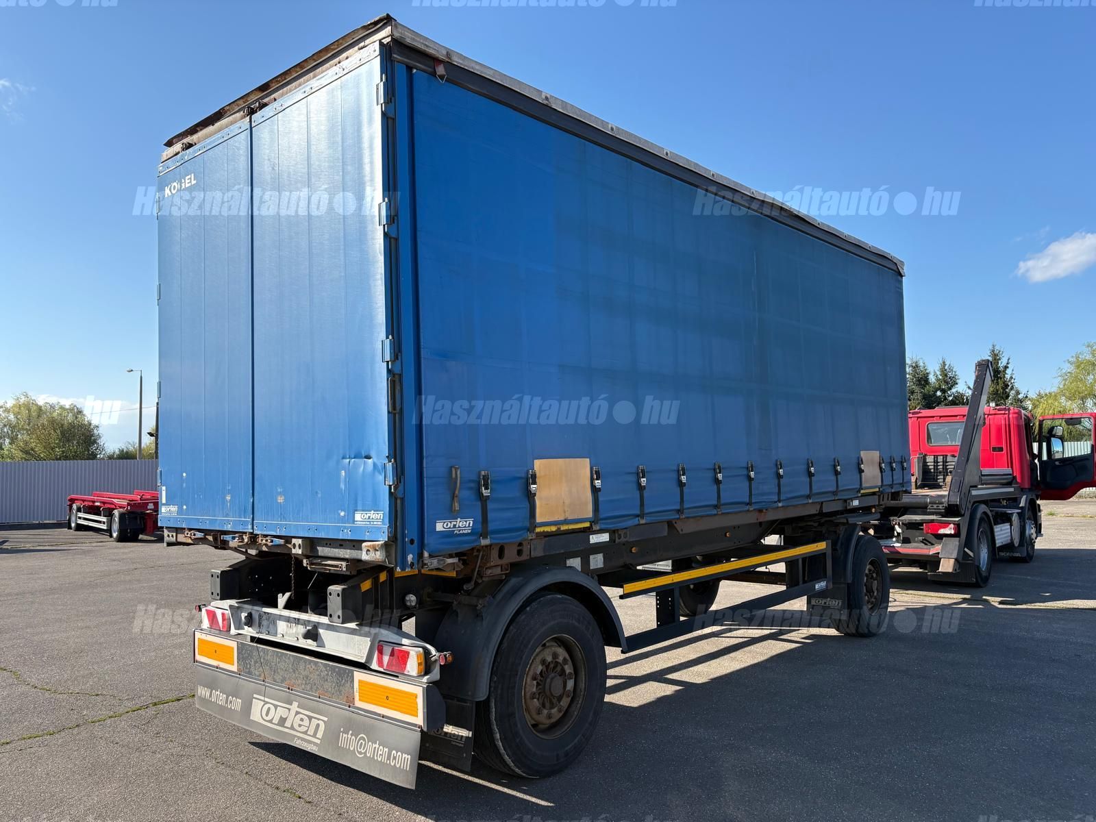 KÖGEL ENCO74 BDF függönyponyvás felépítmény, hátsó portálajtó, melynek hossza: 7,3m, szélessége: 2,5m, magassága: 2,75m. A felépítmény önsúlya: 2,486kg, össztömeg: 16,000kg, hasznos: 13,514kg.