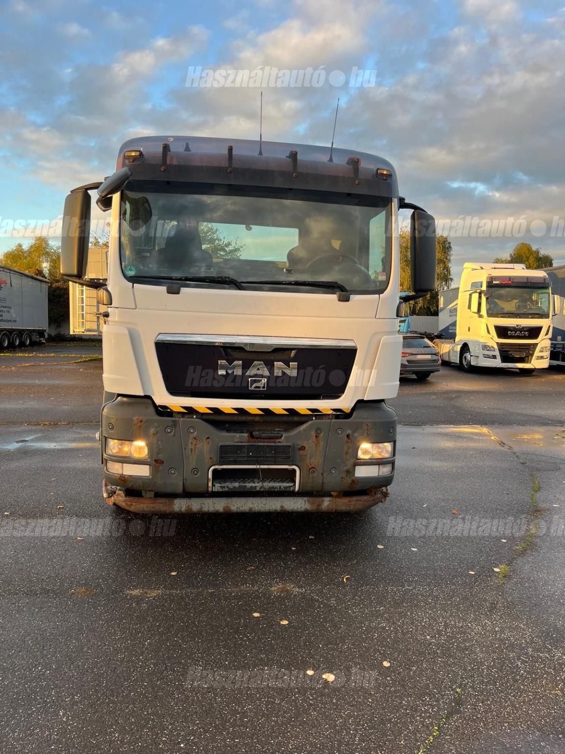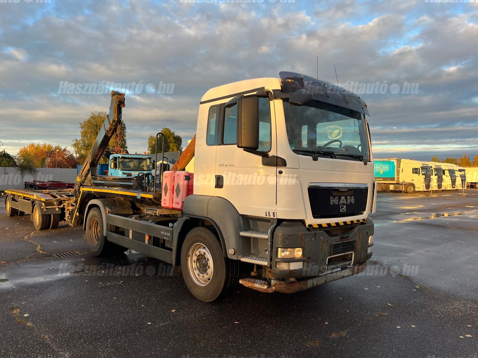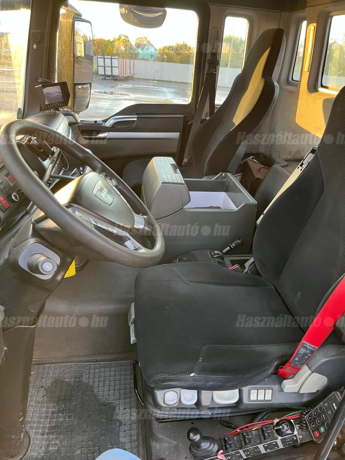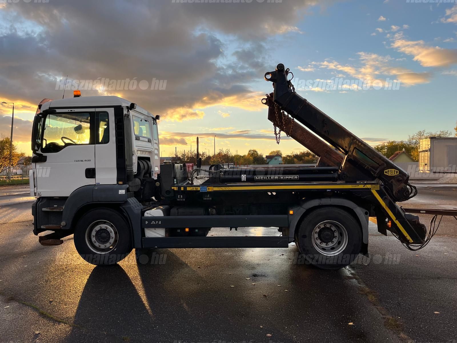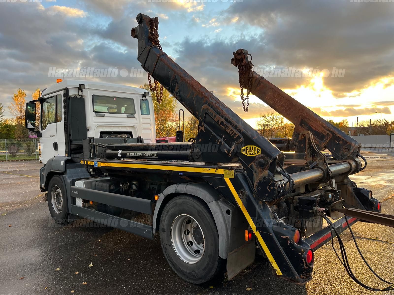 MAN TGS 18.400 EU5, Meiller AK12M1 kétkaros konténerszállító felépítmény (13 tonna teherbírás), ÚJ KUPLUNG! automata váltó, tárcsafék, elől laprugó, hátul légrugó. Automata klíma, állítható kormány, központi zár, differenciálzár, tempomat, ABS, EBS, elektromos ablakok és tükrök, tükörfűtés, aláfutásgátló, rádió, pótkerék tartó, Ad-blue, fűthető ülés, napellenző, forgólámpa, Rockinger vonófej (vontatás: 24,000kg). Tengelytávolság: 3,9m. Gumiméret elől: 385/65 R22,5, hátul: 315/80 R22,5. Önsúly: 10,000kg, össztömeg: 18,000kg, hasznos: 8,000kg. Igény szerint friss műszakival! Uniós adószámmal rendelkező cégek áfa mentesen( nettó) is megvásárolhatják. A hirdetésben szereplő Forintos ár 387 huf/euróra vonatkozó ár! Pontos forintos ár az aktuális napi euró MNB árfolyamától függően kerül kialakításra!