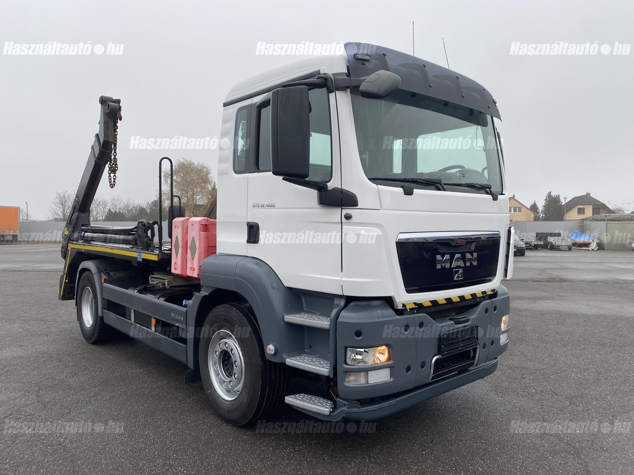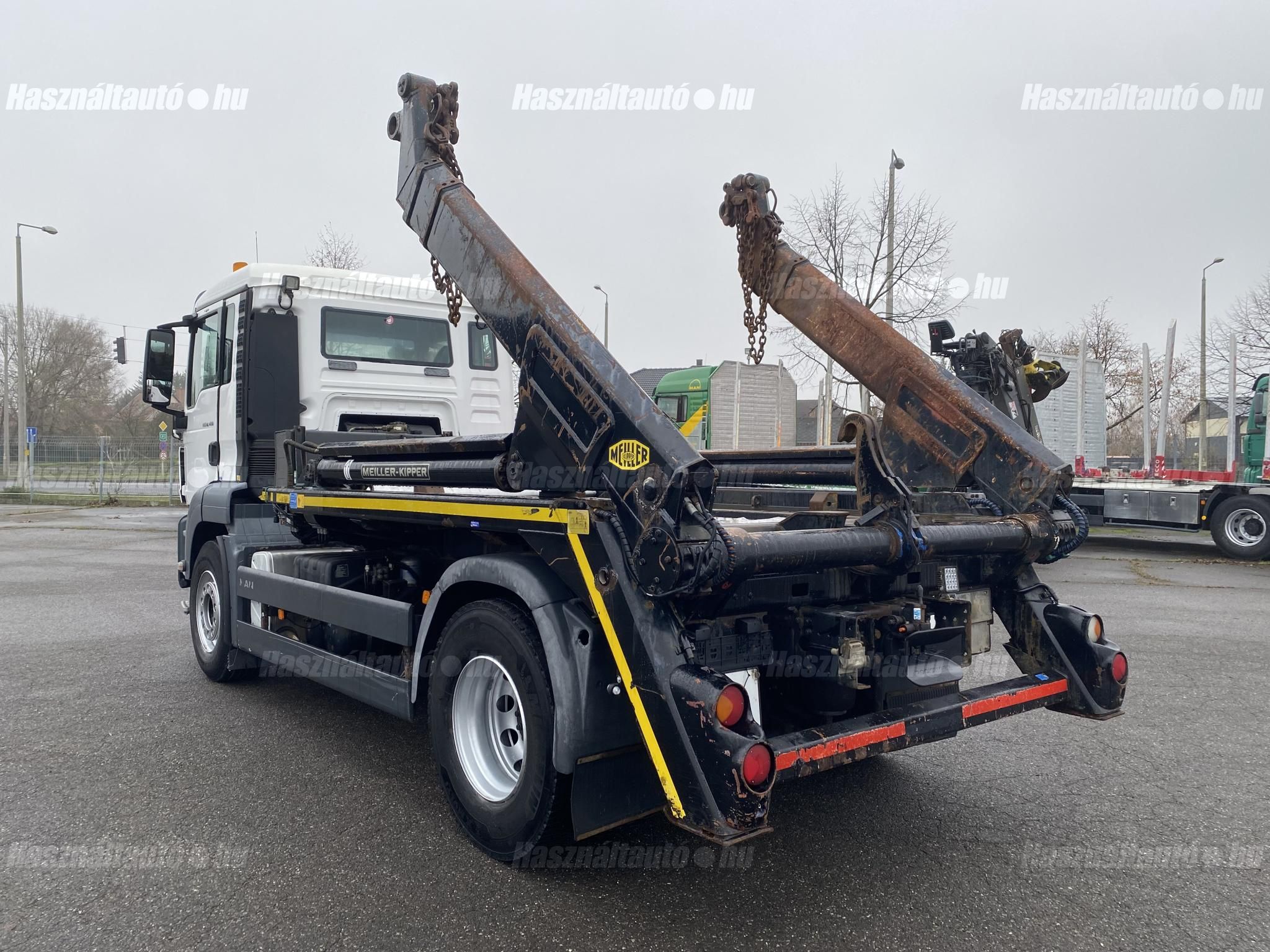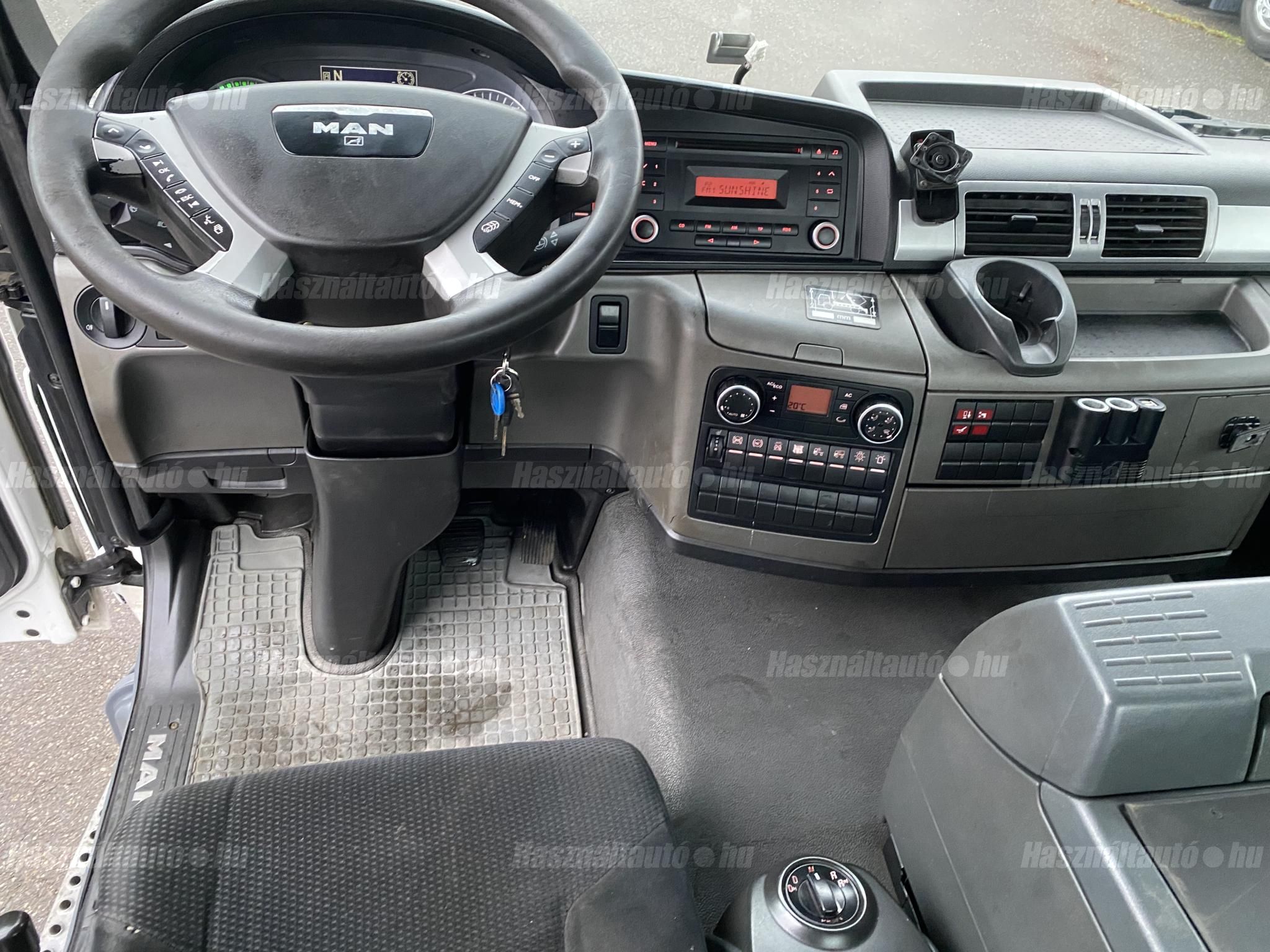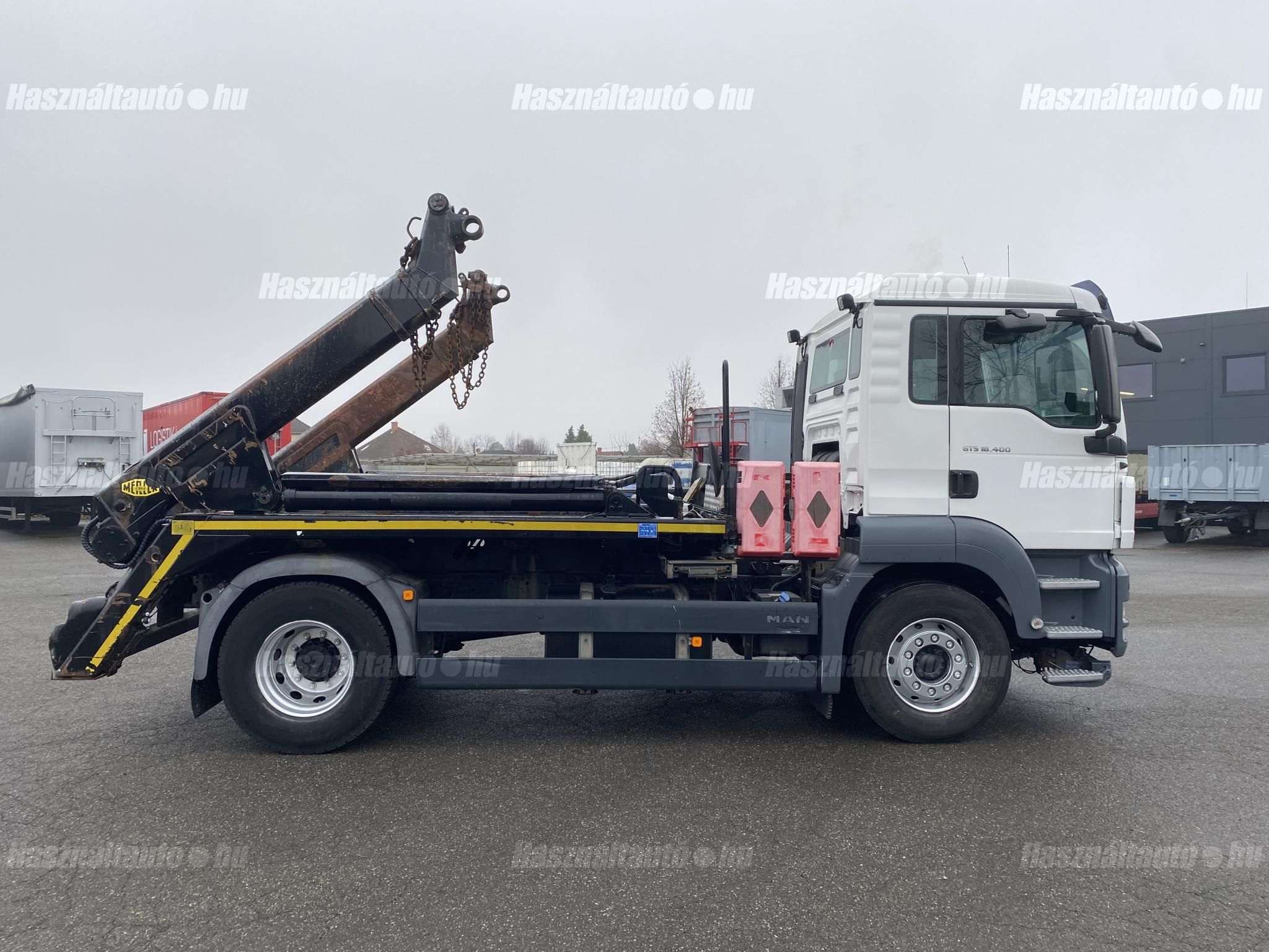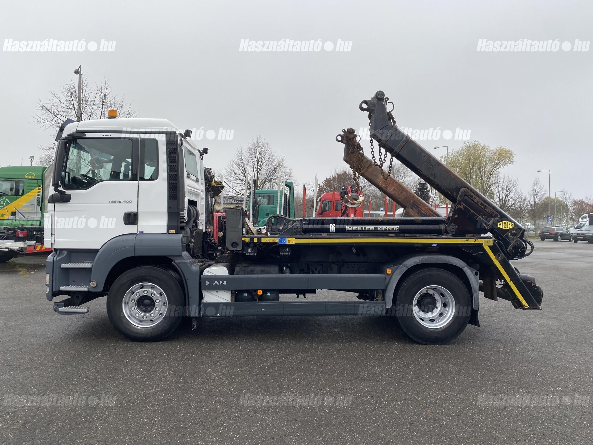MAN TGS 18.400 EU5, Meiller AK12M1 kétkaros konténerszállító felépítmény (13 tonna teherbírás), ÚJ KUPLUNG! automata váltó, tárcsafék, elől laprugó, hátul légrugó. Automata klíma, állítható kormány, központi zár, differenciálzár, tempomat, ABS, EBS, elektromos ablakok és tükrök, tükörfűtés, aláfutásgátló, rádió, pótkerék tartó, Ad-blue, fűthető ülés, napellenző, forgólámpa, Rockinger vonófej (vontatás: 24,000kg). Tengelytávolság: 3,9m. Gumiméret elől: 385/65 R22,5, hátul: 315/80 R22,5. Gumiállapot elől ca. 40%, hátul ca. 60%. Önsúly: 10,000kg, össztömeg: 18,000kg, hasznos: 8,000kg. Igény szerint friss műszakival! Uniós adószámmal rendelkező cégek áfa mentesen( nettó) is megvásárolhatják. A hirdetésben szereplő Forintos ár 387 huf/euróra vonatkozó ár! Pontos forintos ár az aktuális napi euró MNB árfolyamától függően kerül kialakításra!