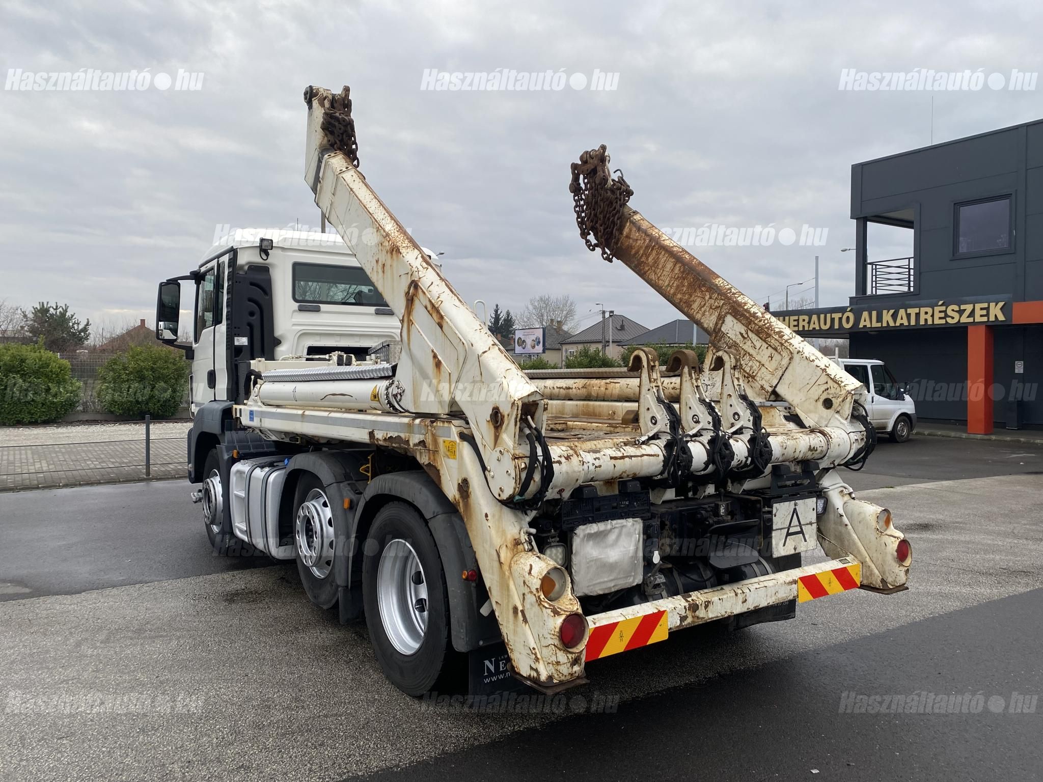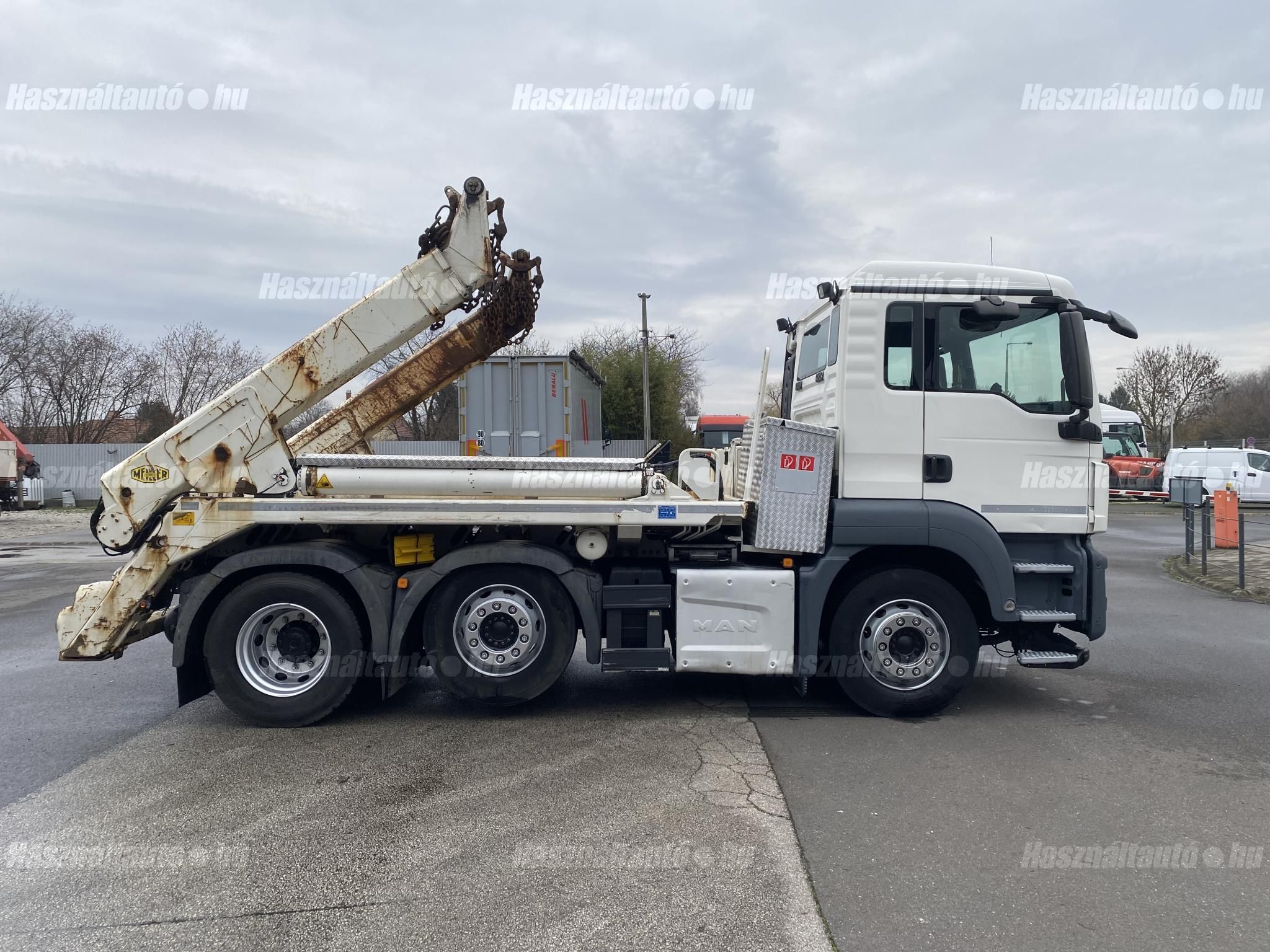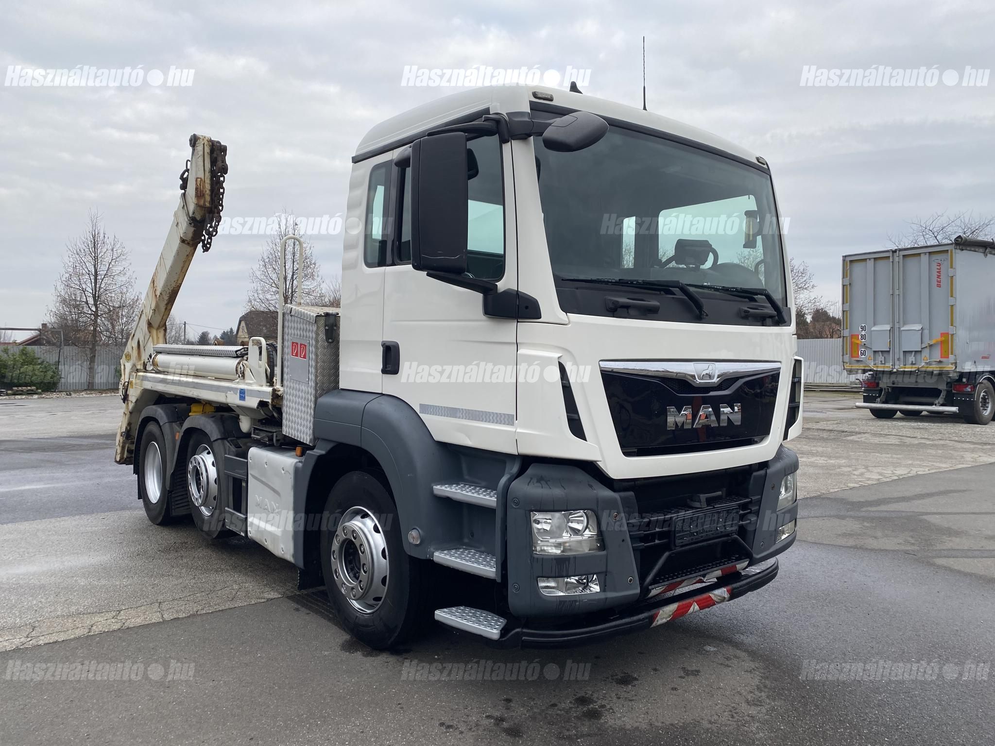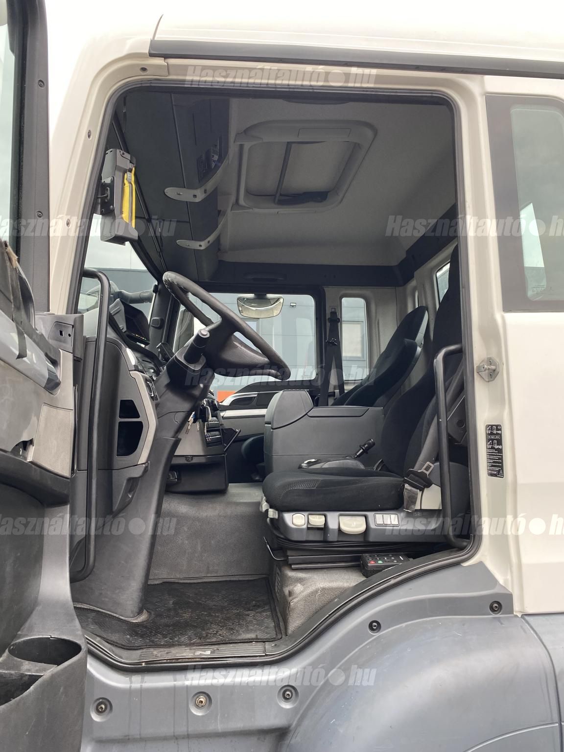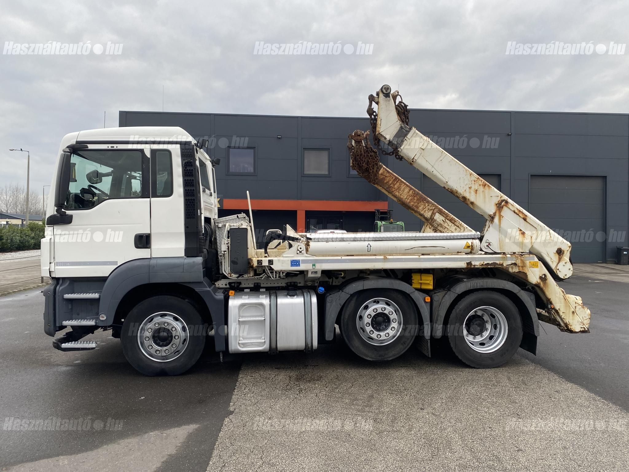 MAN TGS 26.400 6X2, EU6, Meiller AK16NT kétkaros láncos konténeres felépítmény (17 tonna teherbírás)+távirányító, emelhető tengely, automata váltó, tárcsafék, első tengely laprugós, hátsó tengelyek légrugósak. Automata klíma, állítható kormány, központi zár, differenciálzár, tempomat, ABS, EBS, ASR, ESP, elektromos ablakok és tükrök, tükörfűtés, aláfutásgátló, rádió, Ad-blue, fűthető ülés, hűtőbox, tolatókamera, Rockinger vonófej. Tengelytávolság A-B tengely: 2,6m, B-C tengely: 1,3m. Gumiméret: 315/70 R22,5. Gumiállapot ca. 70%. Önsúly: 12,524kg, össztömeg: 26,000kg, hasznos: 13,476kg. Igény szerint friss műszakival. Uniós adószámmal rendelkező cégek áfa mentesen( nettó) is megvásárolhatják. A hirdetésben szereplő Forintos ár 387 huf/euróra vonatkozó ár! Pontos forintos ár az aktuális napi euró MNB árfolyamától függően kerül kialakításra!