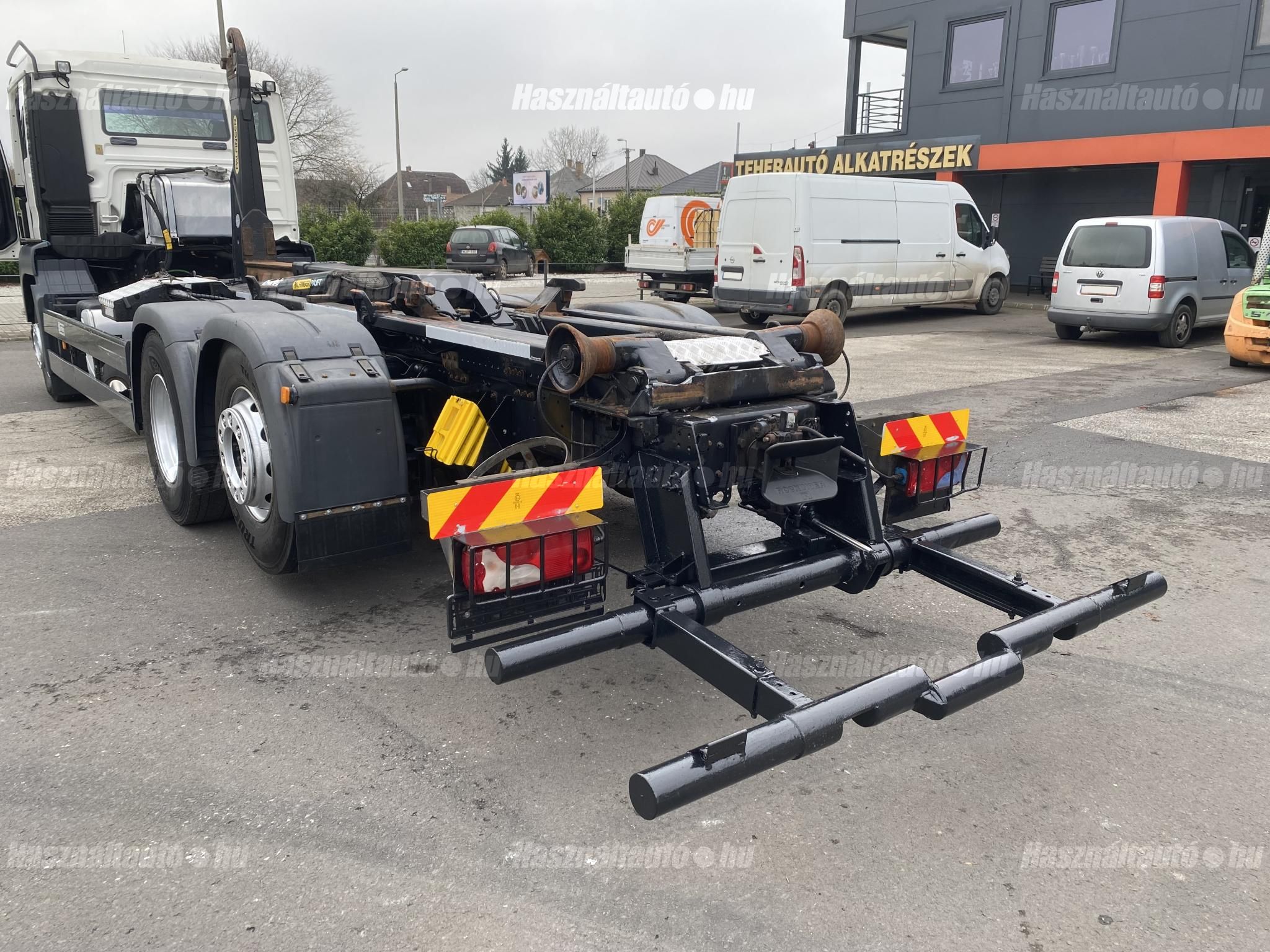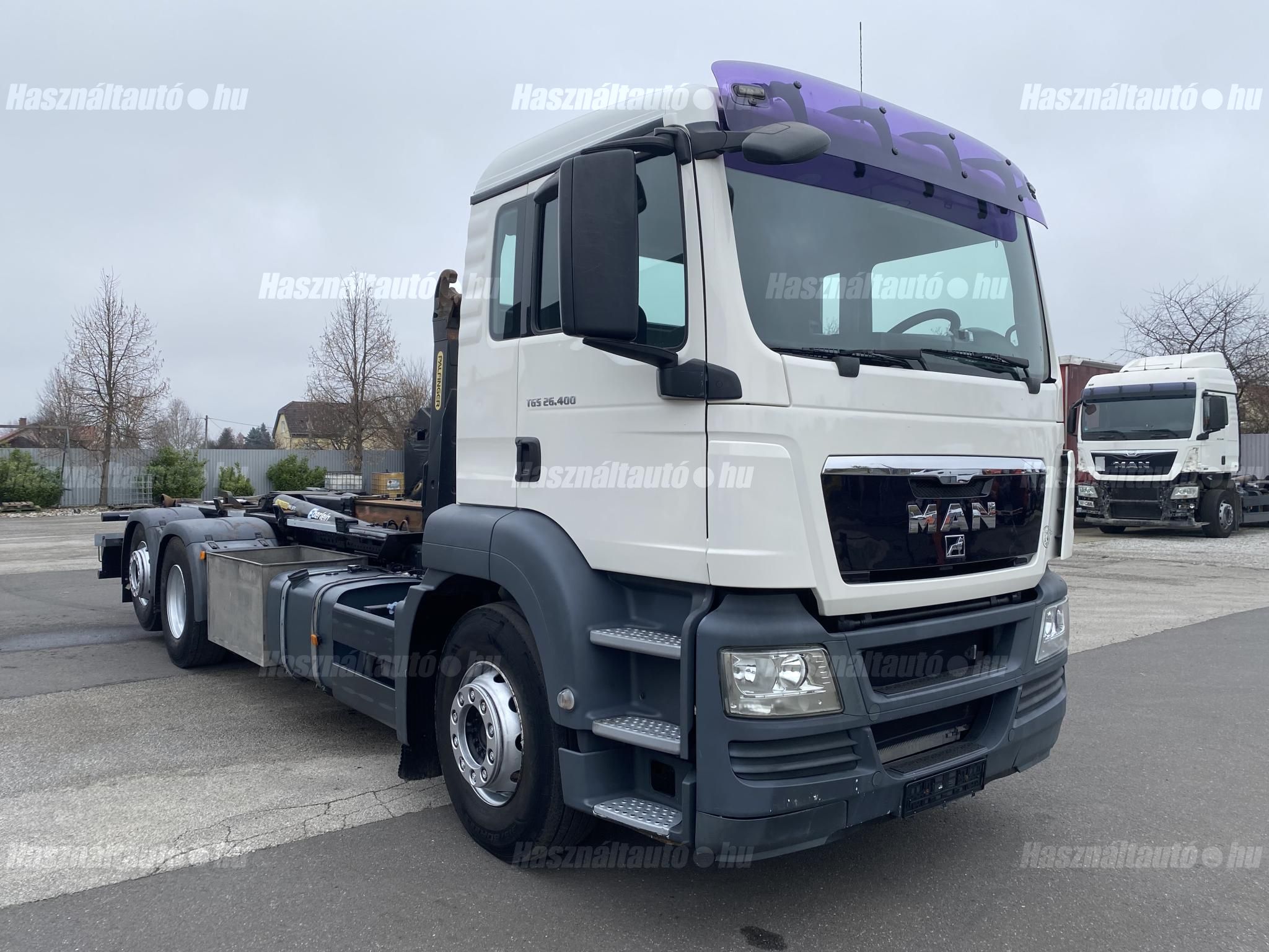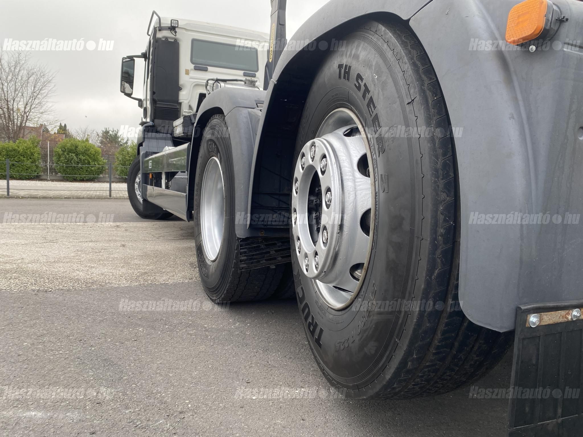 MAN TGS 26.400 6X2, EU5, Palfinger multilift felépítmény, darufogadás kiépítés, kormányzott emelhető tengely, automata váltó, tárcsafék, első tengelyen laprugó, hátsó tengelyek légrugósak. Automata klíma, állítható kormány, központi zár, differenciálzár, tempomat, ABS, EBS, ASR, elektromos ablakok és tükrök, tükörfűtés, aláfutásgátló, rádió, Ad-blue, hűtőbox, napellenző, Rockinger vonófej (vontatás: 25,577kg). Tengelytávolság A-B tengely: 4,8m, B-C tengely: 1,3m. Gumiméret: 315/80 R22,5. Gumiállapot az első tengelyen ca. 70%, hátsó tengelyeken ca. 50%. Önsúly: 13,660kg, össztömeg: 26,000kg, hasznos: 12,340kg. Igény szerint friss műszakival. Uniós adószámmal rendelkező cégek áfa mentesen( nettó) is megvásárolhatják. A hirdetésben szereplő Forintos ár 380 huf/euróra vonatkozó ár! Pontos forintos ár az aktuális napi euró MNB árfolyamától függően kerül kialakításra!